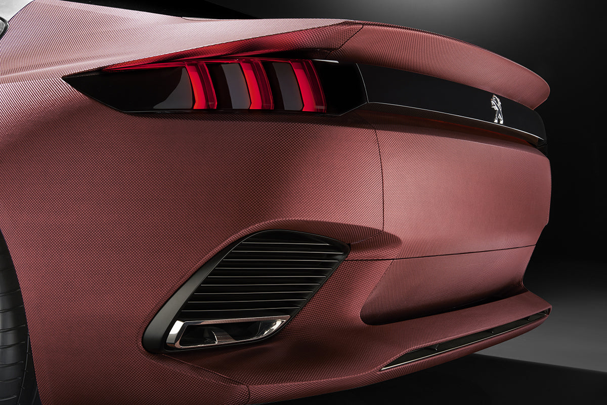 L’arrière de la carrosserie sera recouvert par le centre de style Peugeot d’un textile efficient de couleur rouge. Ce textile est inspiré de la microstructure de la peau de requin et permet de diminuer la portance des flux d’air et donc de gagner en consommation.